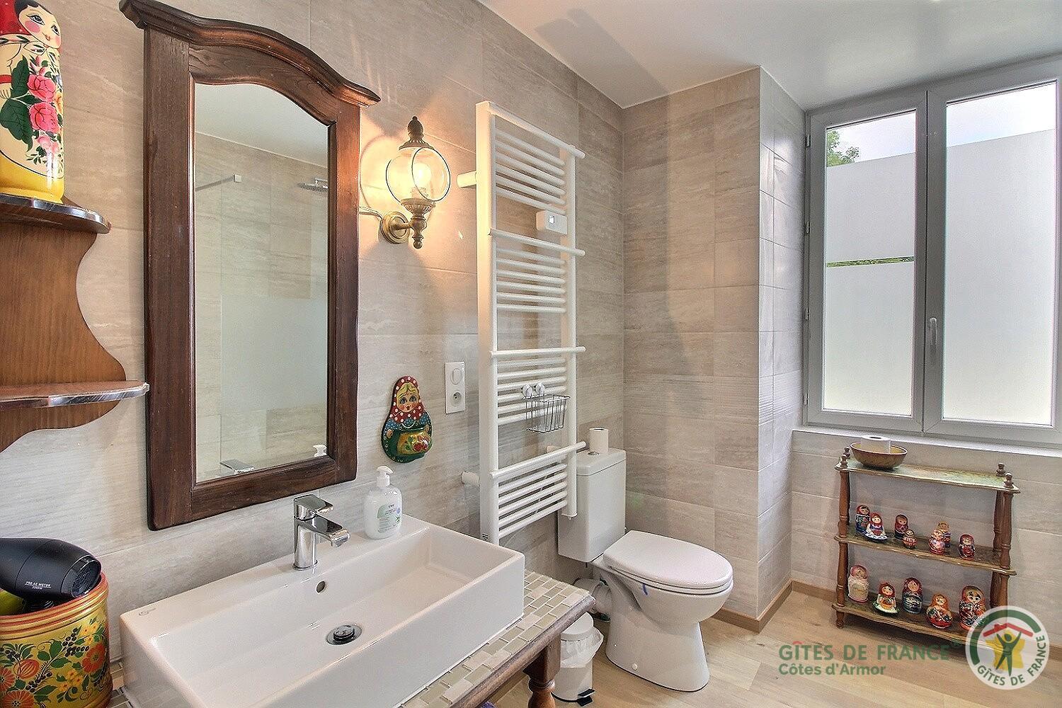 Elle se situe au 1er étage, orientée Ouest afin de profiter des couchers de soleil sur le village pittoresque de Gouarec.